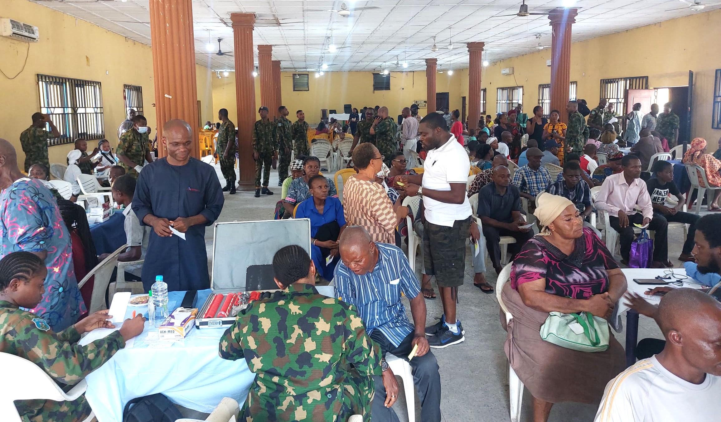 Residents of Elekahia community in Obio Akpor, Rivers State, receiving free medical services to mark the 60th anniversary of Nigerian Air Force in Port Harcourt on Wednesday