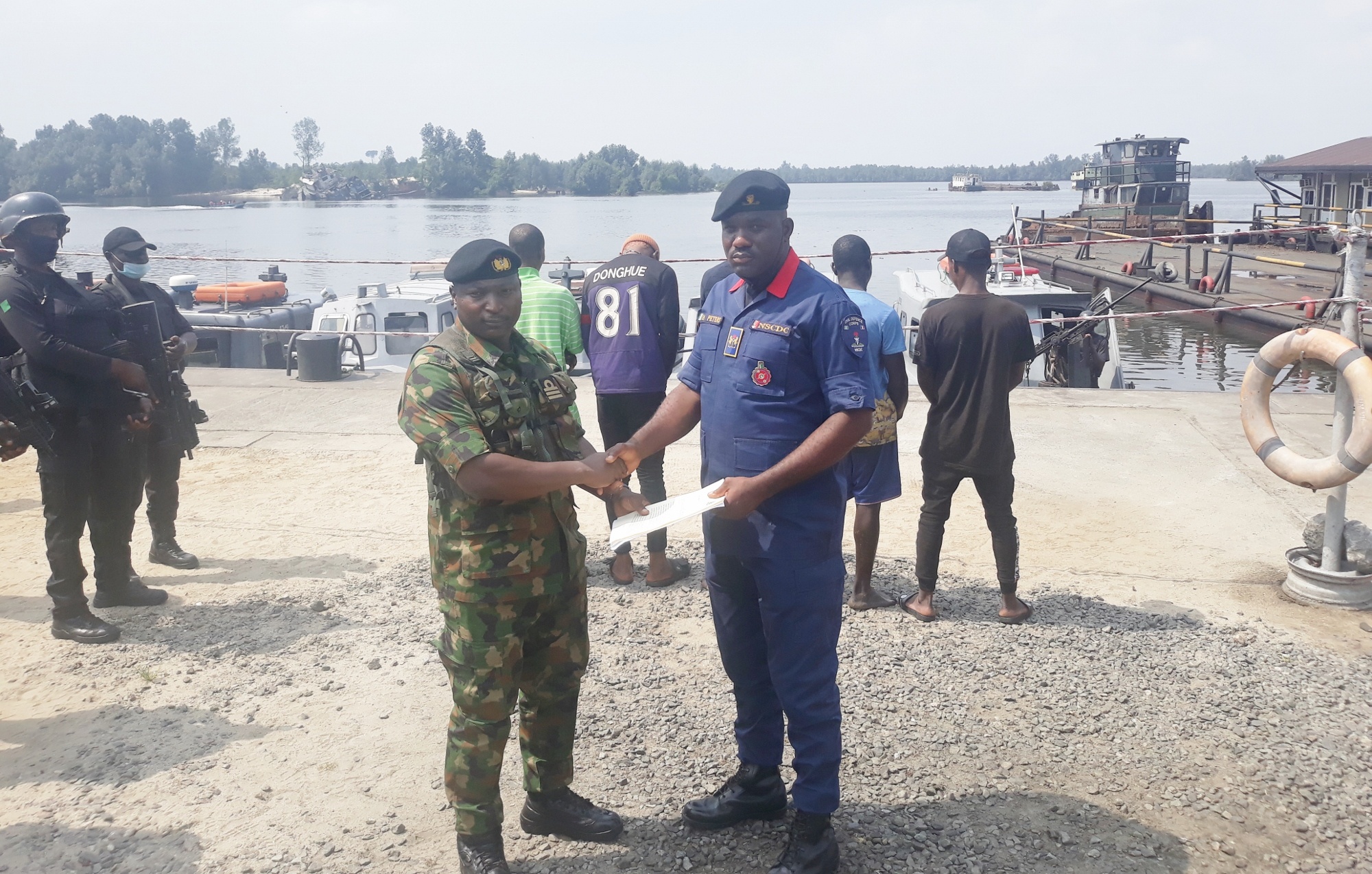 Cdr. Umar Sidi, Base Operations Officer, Nigerian Navy Ship (NNS) Pathfinder Port Harcourt, on Saturday handed over the suspects and items to the Nigerian Security and Civil Defence Corps (NSCDC).