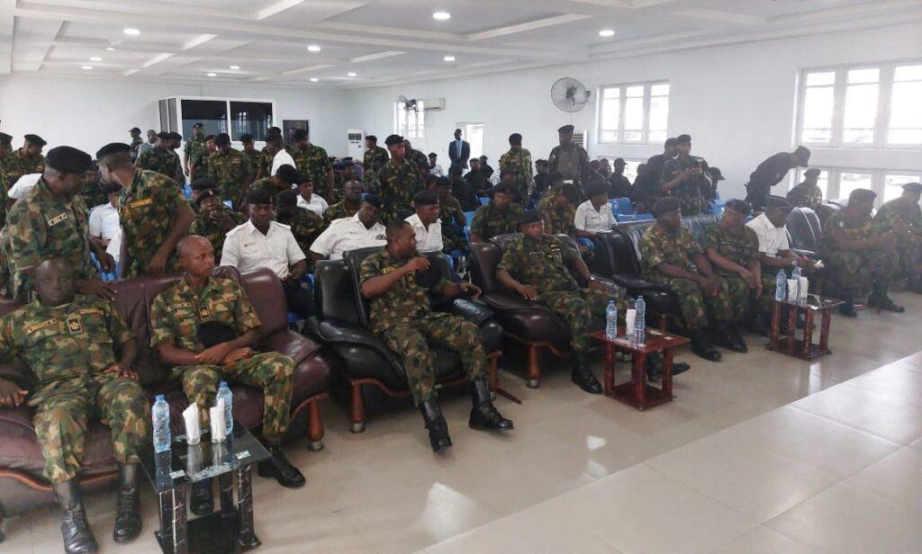 Front row; L-R: The Flag Officer Commanding (FOC) Eastern Naval Command (ENC), Rear Adm. Olusola Oluwagbire and the Commander of the Nigeria Navy Ship (NNS) Pathfinder Port Harcourt, Commodore Suleiman Ibrahim during the FOC’s tour of facilities at the NNS Pathfinder base in Port Harcourt on Monday
