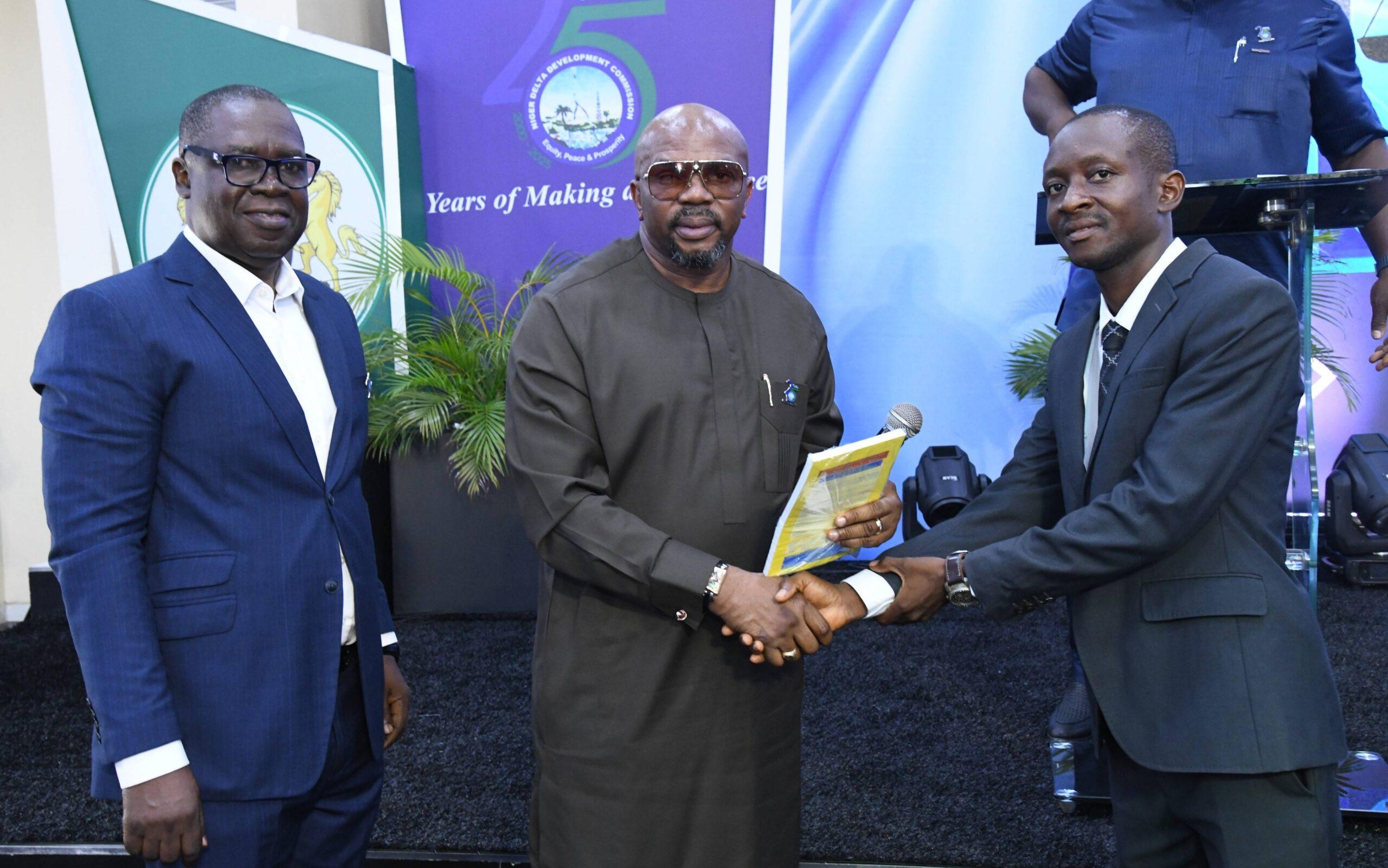 L-R: NDDC’s Acting Director of Legal Services, Victor Arenyeka; NDDC Executive Director of Finance and Administration, Boma Iyaye, presenting Law Reports to Abia State University law student, Dr Enwere Oguchinalu during the competition in Port Harcourt