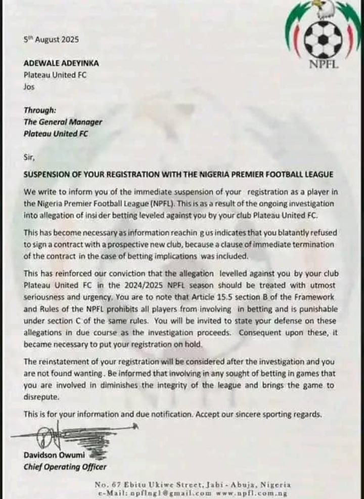 The News Agency of Nigeria (NAN) reports that the NPFL suspended the registration of Plateau United goalkeeper Adewale Adeyinka over allegations of involvement in insider betting.