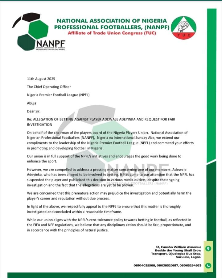 Abuja, Aug. 11, 2025 (NAN) In a passionate appeal grounded in fairness and justice, the National Association of Nigerian Professional Footballers (NANPF) has called on the Nigeria Premier Football League (NPFL) to exercise caution and uphold due process in its handling of the recent betting allegation against goalkeeper Adewale Adeyinka.