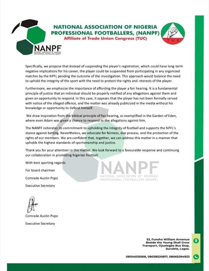 While reaffirming its support for the NPFL’s zero-tolerance stance on betting, the union stressed that disciplinary action must be proportionate and guided by natural justice, not media headlines or unverified claims.