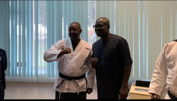 CSP Kalu Chijioke Erem poses with the Former Minister of Sports and youth development during his black decoration ceremony by the Mixed Martial Arts Federation at the Moshood Abiola Stadium