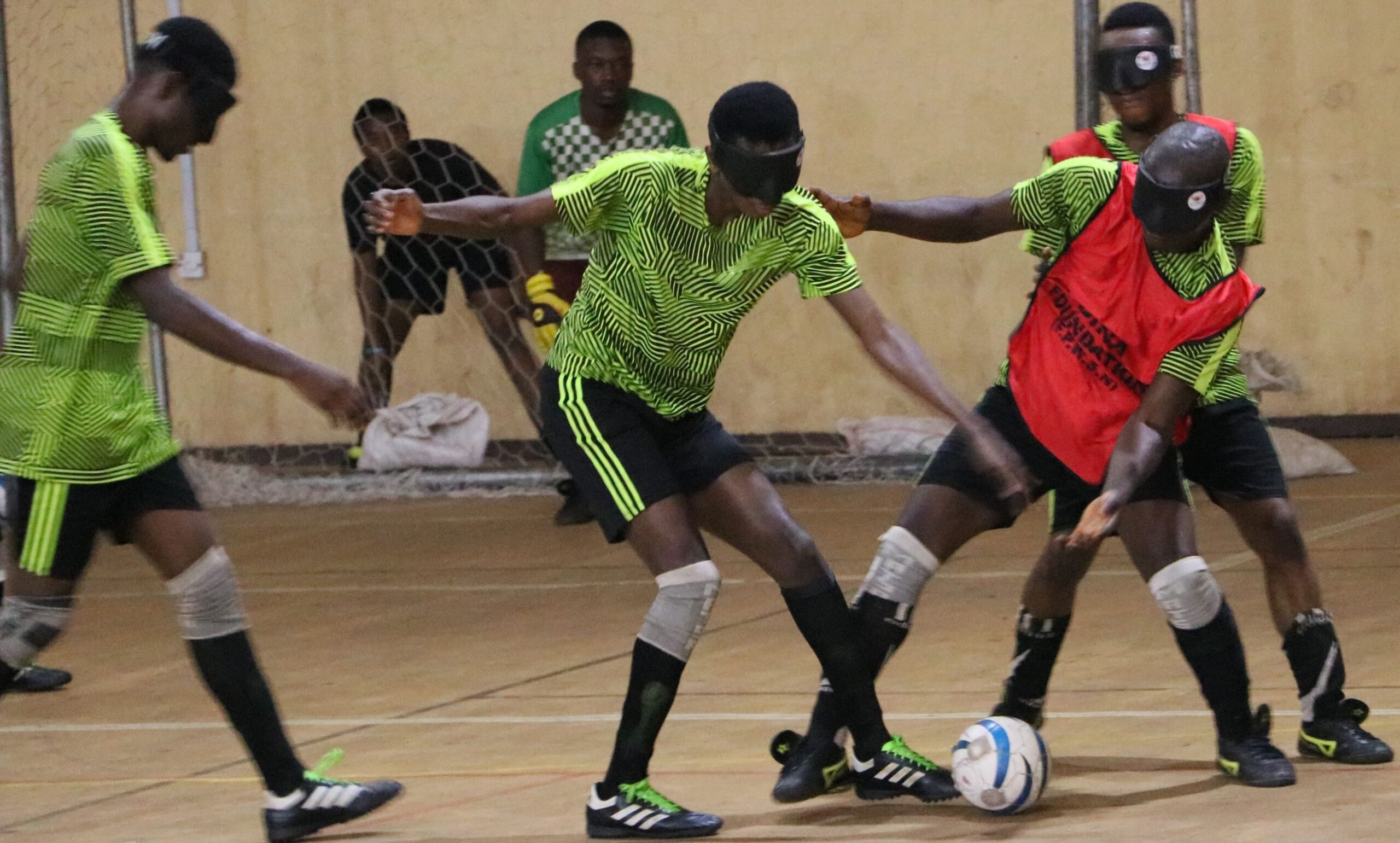 The game of blind football involves five players per team of which only the goalkeeper is visually sound. The other four members of a team must be visually impaired. To ensure that the players are not partially visual impaired, tick synthetic gadgets are further used to blind their eyes before they move into the field.