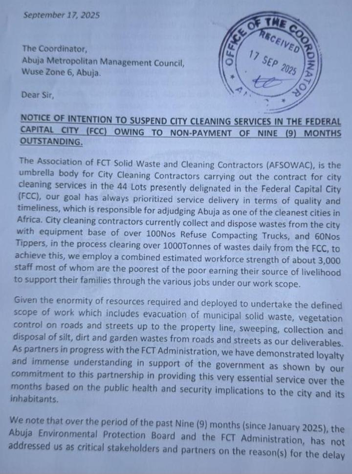 In the letter made available to the News Agency of Nigeria (NAN) on Friday, the group said it could no longer guarantee continued cleaning services in the Federal Capital City (FCC) without urgent payment.