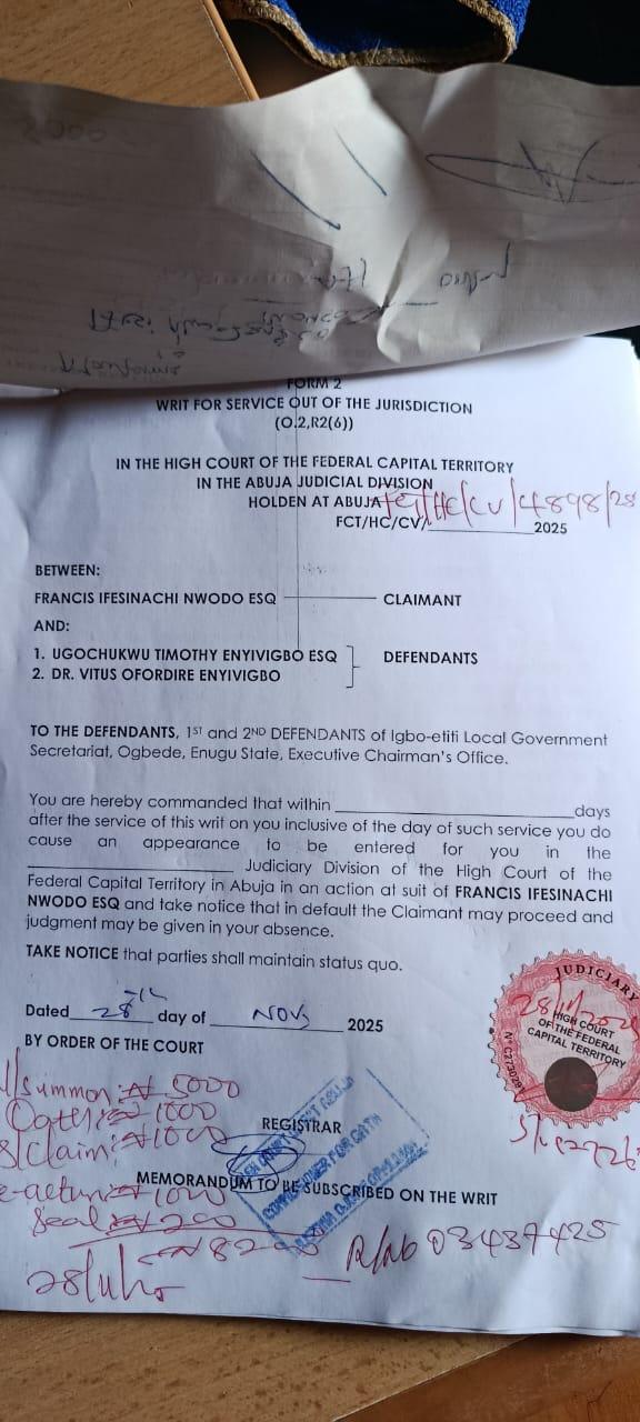 Chief Ifesi Nwodo who is into active legal practice in Abuja and a 2023 NNPP Deputy Governorship candidate in Enugu state took this step having written to the 1st defendant a demand letter of retraction and an unreserved apology on October 31, 2025 after he was called ‘Nkarika lawyer ‘ which translates to ‘fake, useless and or stupid lawyer’.