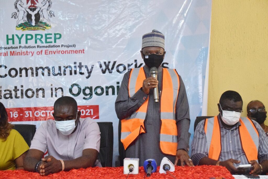 Minister of Environment, Dr Mohammed Abubakar addressing participants during flag-off of Livelihood Needs Assessment Programme in Bori, Rivers State on Tuesday