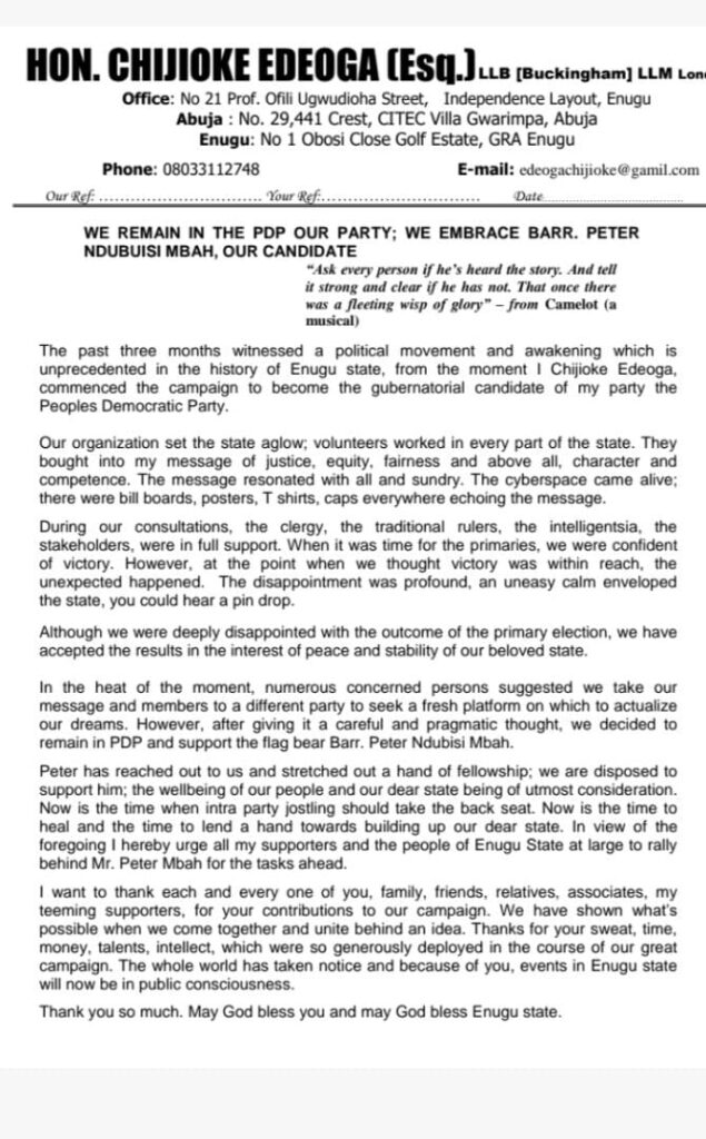 Hon. Barr. Chijioke Edeoga, foremost aspirant and runner up in the recently concluded Enugu State People’s Democratic Party, PDP, gubernatorial primary, has declared his support for Barr. Peter Mbah, who had emerged winner at the end of the exercise, after the later had extended the olive branch.