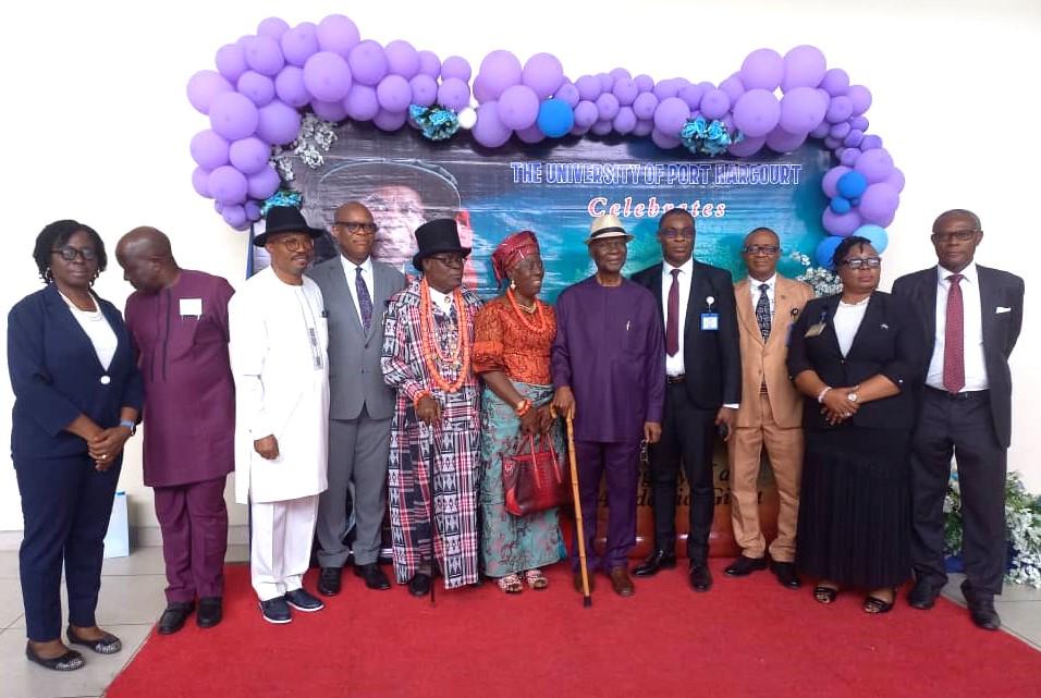 Former Vice Chancellor of University of Port Harcourt (UNIPORT) in 1982, Prof. Sylvanus Cookey (seventh from left), at a biography book presentation celebrating his 90th birthday in Port Harcourt
