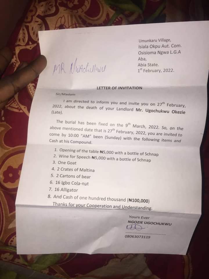 He shared the letter addressed to him with the caption, “You never see anything sef . My landlord just died and his son wrote a list of items that I will give to him as his tenant for his burial rites.”