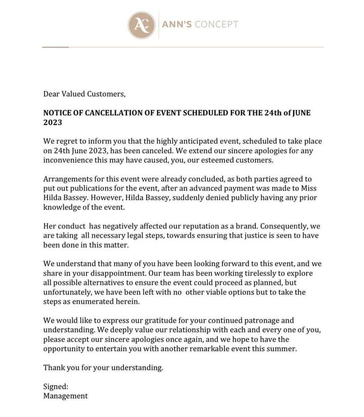 “However, Hilda Bassey suddenly denied publicly having any prior knowledge of the event. Her conduct has negatively affected our reputation as a brand. Consequently, we are taking all necessary legal steps towards ensuring that justice is seen to have been done in this matter.”