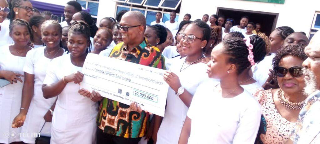 The former Governor of Anambra State, Mr Peter Obi, has donated N20 million to the Godfrey Okoye University (GOUNI), Enugu in support of their ongoing hospital project.