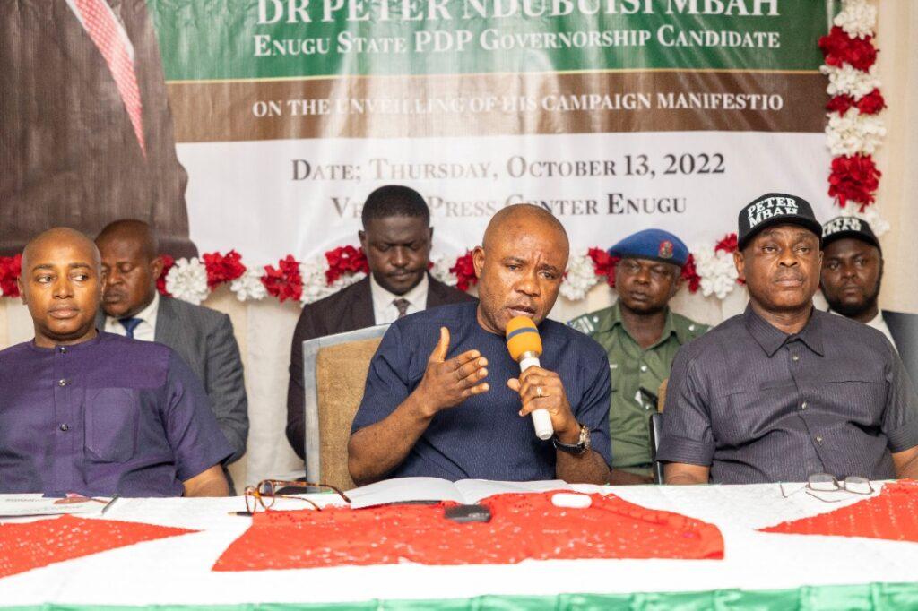 The Enugu State governorship candidate of the Peoples Democratic Party, PDP, Dr. Peter Mbah on Thursday addressed a world press conference at the Enugu Press Center, after the public unveiling of his manifesto earlier in the day.
